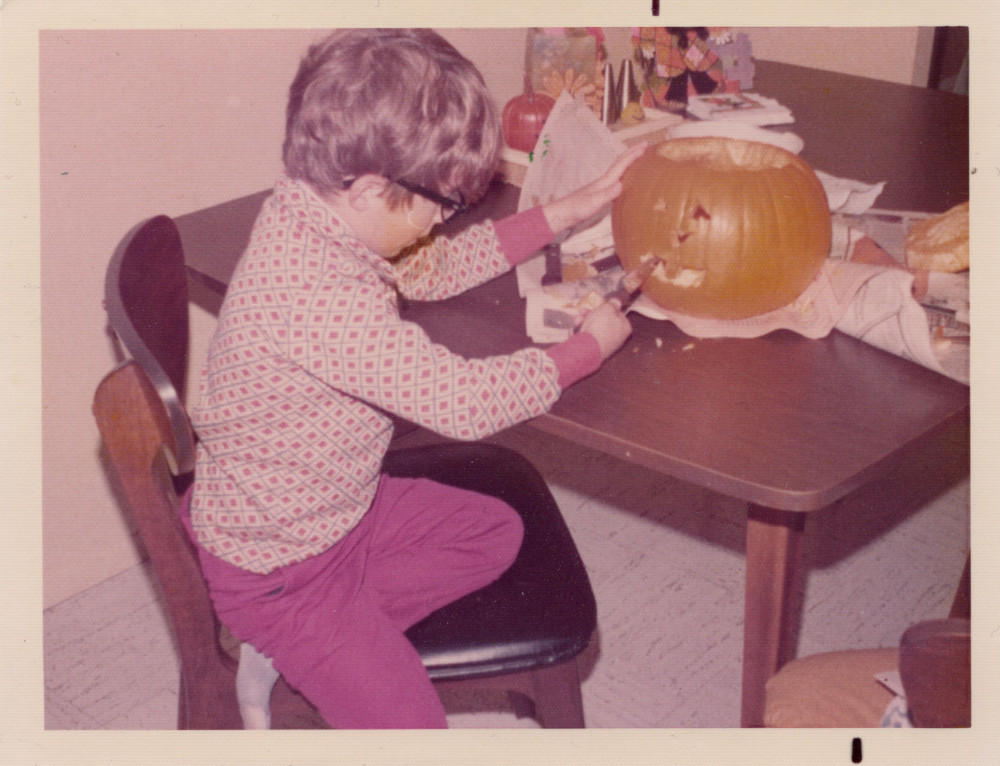 This photo surfaced in 2025, having been in the possession of a cousin. It may not be the first time I carved a pumpkin, but it's certainly close! See if you can spot the early evidence of my signature style.
