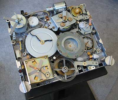 Subjective Time Display - Time as we perceive it is merely the orthogonal projection of a function that actually extends across many dimensions (hence its apparent "flying" and "dragging"). The ST display uses hands that leave the plane and a mechanism to raise and lower the entire face in order to provide a full representation of the inherent complexities. |